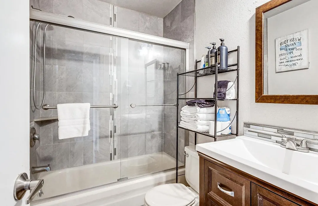 Im Shuttle To Winter Park Resort Mtn-View Condo! sorgen eine Dusche und eine Waschmaschine für Ihren Komfort.